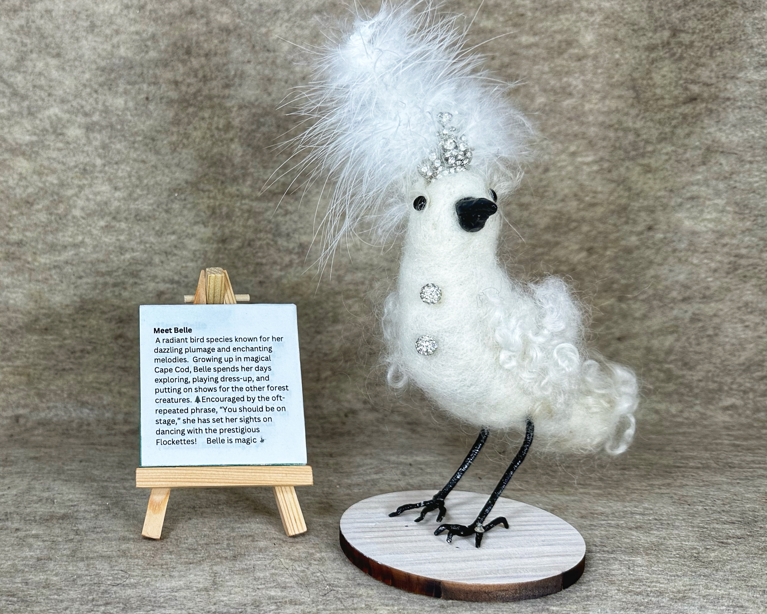 Dressed to impress, Belle's original outfit is created with 100% wool and woolen locks from sheep. Her feet are wired, her beak is made of clay, her eyes are glass. Her rhinestones glitter with the sun. Belle is sure to be admired wherever she perches in your home or office.
