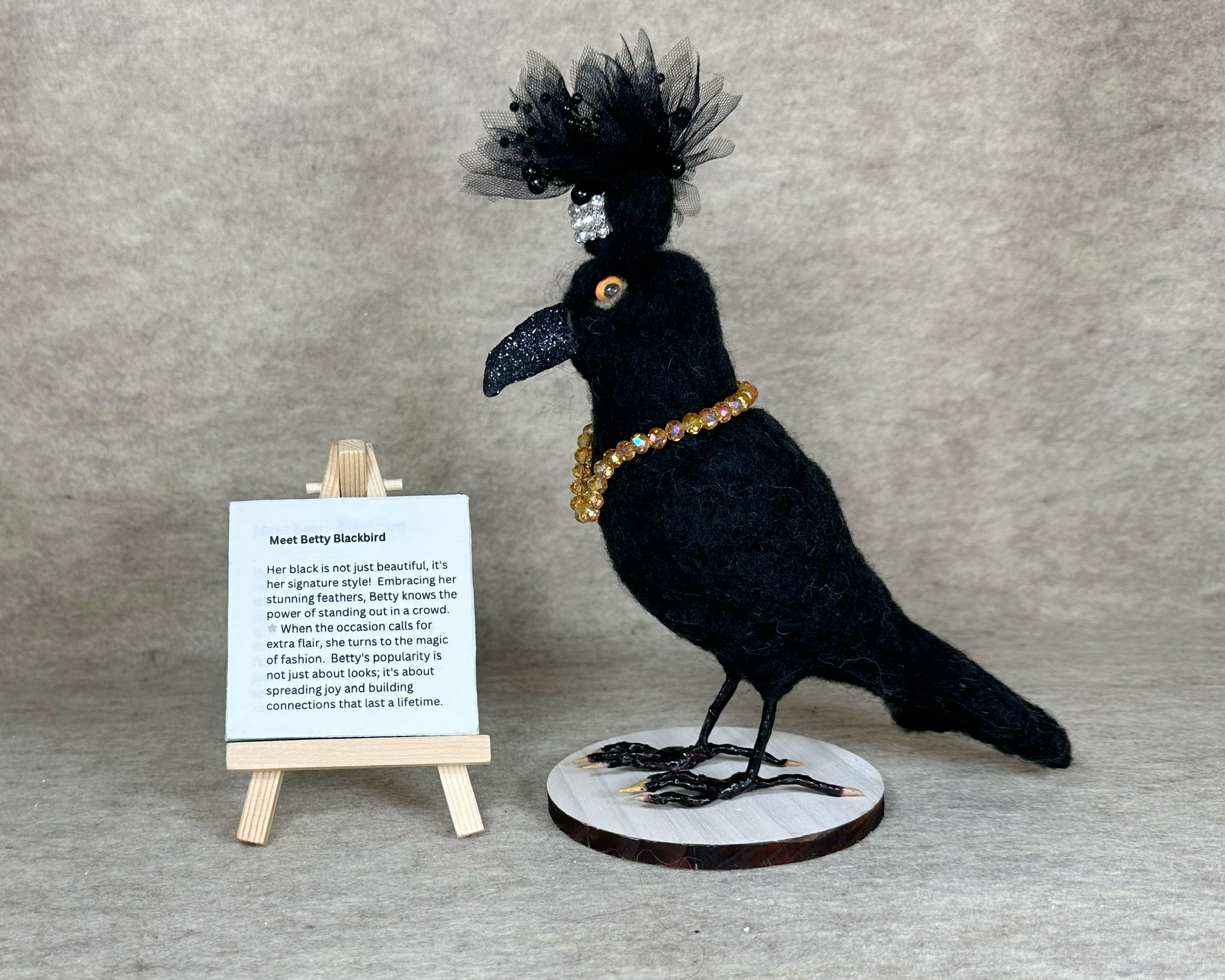 Meet Betty Blackbird – where black is not just beautiful, it's her signature style! Embracing her stunning feathers, Betty knows the power of standing out in a crowd. Yet, when the occasion calls for extra flair, she turns to the magic of fashion.