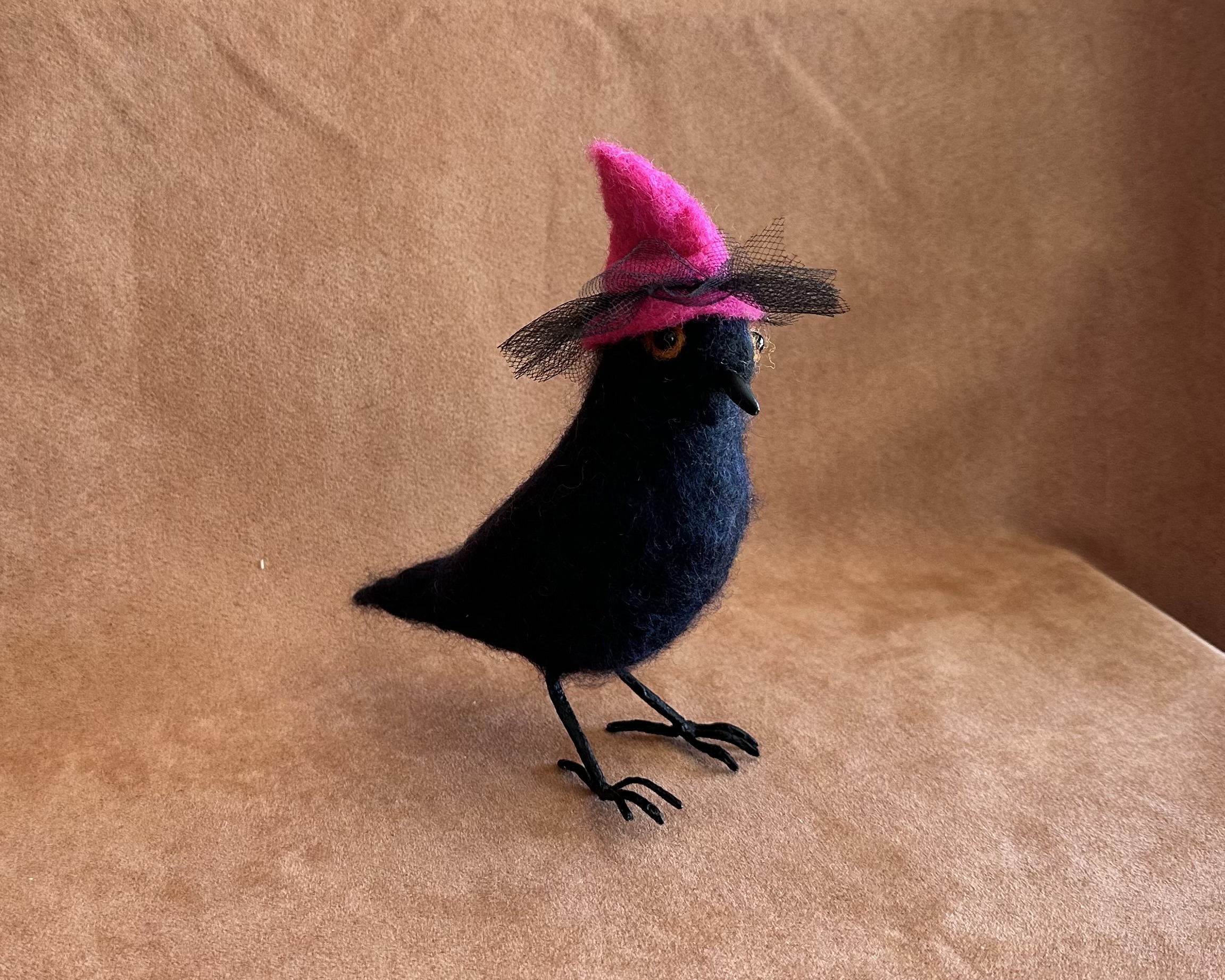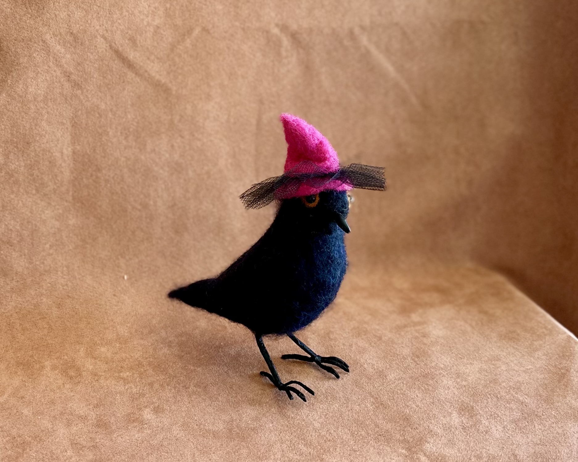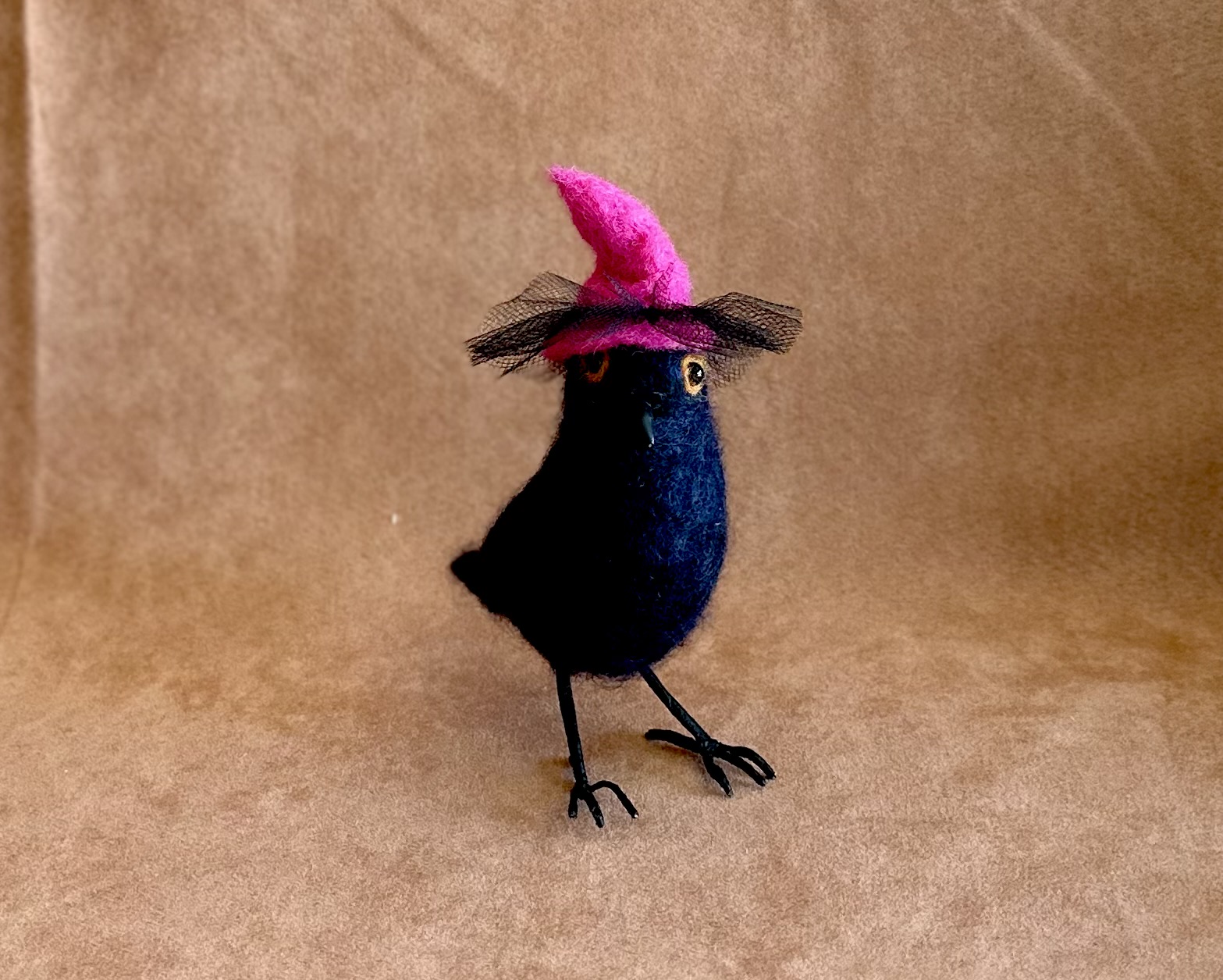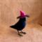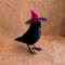 This bold little bird struts into the room in her hot pink witch’s hat, wings shimmering in black and midnight blue. She’s theatrical, confident, and just a touch rebellious—more likely to steal the spotlight than hide in the shadows. Perfect for adding a pop of mischief and flair to your Halloween display.