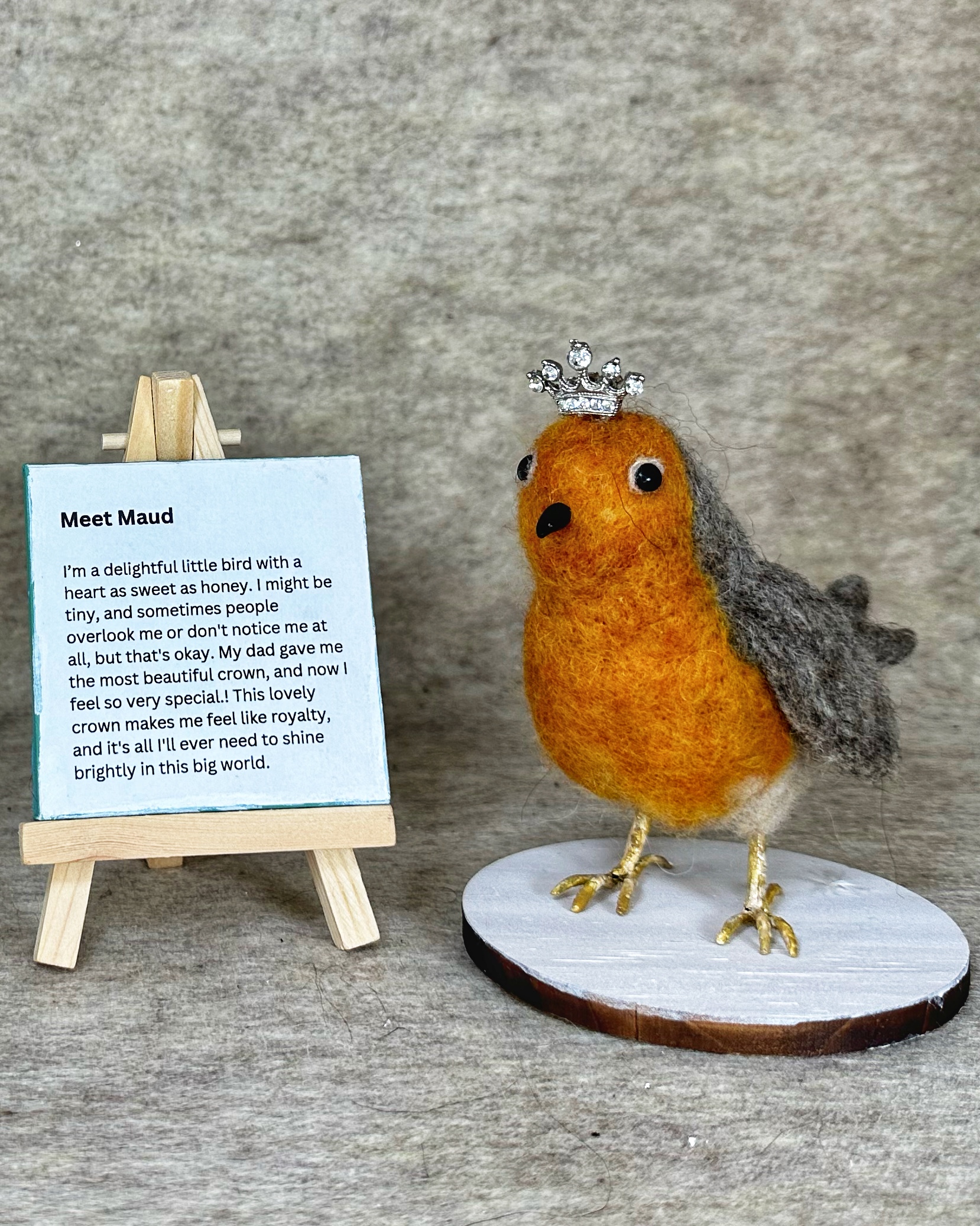 I lovingly handcraft each whimsical little creature, aiming to blend lifelike detail with a playful twist. Imagine them as realistic animals with just a touch of mischief! Most start with a tiny wire armature as their skeleton, which I then carefully wrap in wool, sculpting and shaping them through needle felting until they come to life, with soft, wooly "feathers" to complete the look. The wool I use is sourced from sheep grazing on farms across America, England, and Canada, adding a touch of international flair to each piece. Tiny beaks and hooves are either sculpted from clay and hand-painted or felted from wool, finished with a delicate beeswax coating. While these felted sculptures are crafted with joy and meant to bring smiles, they’re intended for display only—best kept out of the reach of curious little hands and paws.