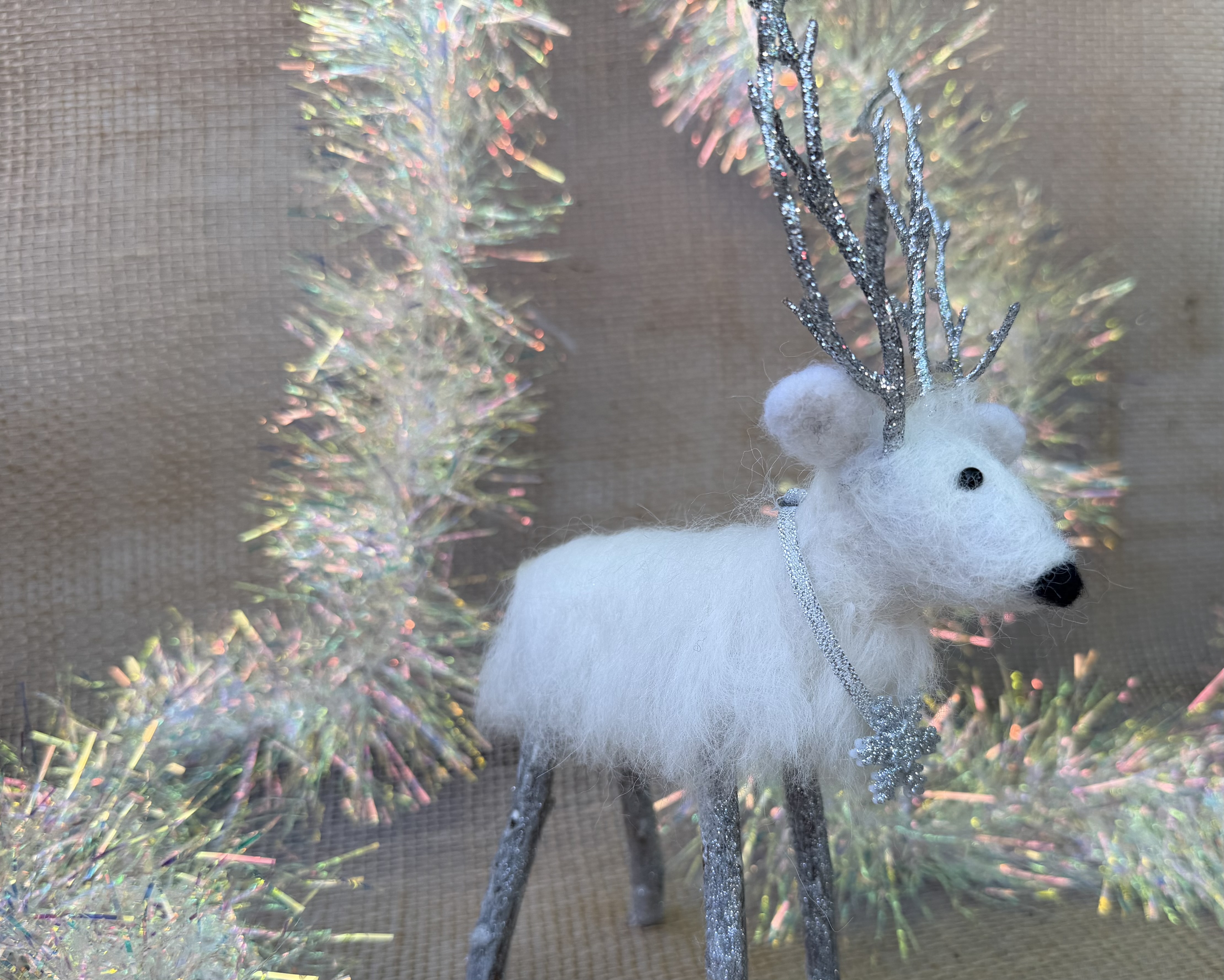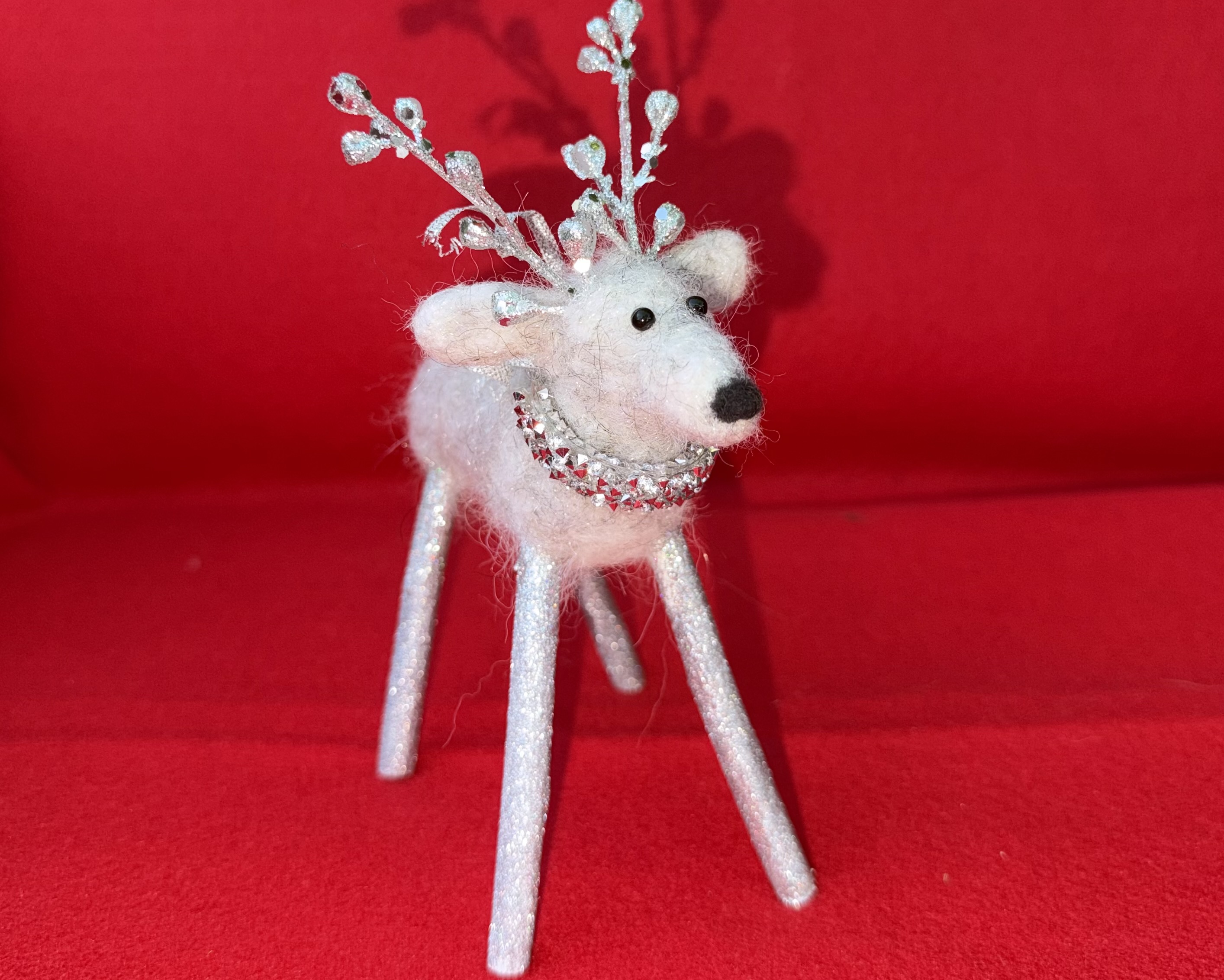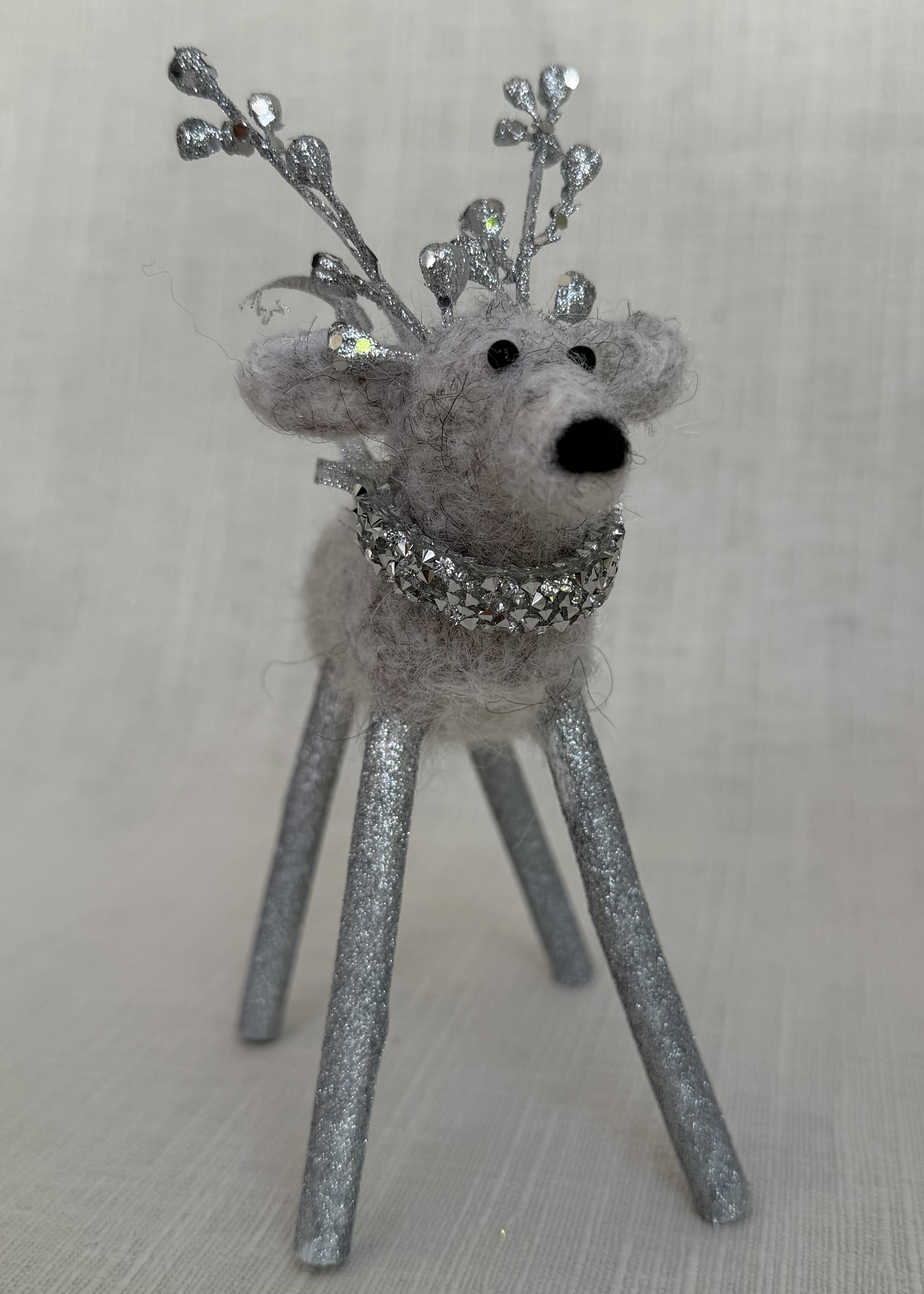 Meet Crystal, a delightful petite needle felted white reindeer brimming with winter wonder. Lovingly handcrafted from soft alpaca wool, Crystal features delicate frosted antlers and a stunning glittery snowflake draped elegantly around her neck like a shimmering collar. Her compact size makes her perfect for smaller spaces, bookshelves, or nestled into holiday vignettes as a younger reindeer. Each detail is carefully sculpted by hand, creating a sweet expression and graceful stance. Crystal's enchanting charm and sparkling accessories make her an ideal gift for reindeer collectors or anyone who treasures handmade holiday magic.