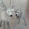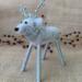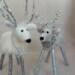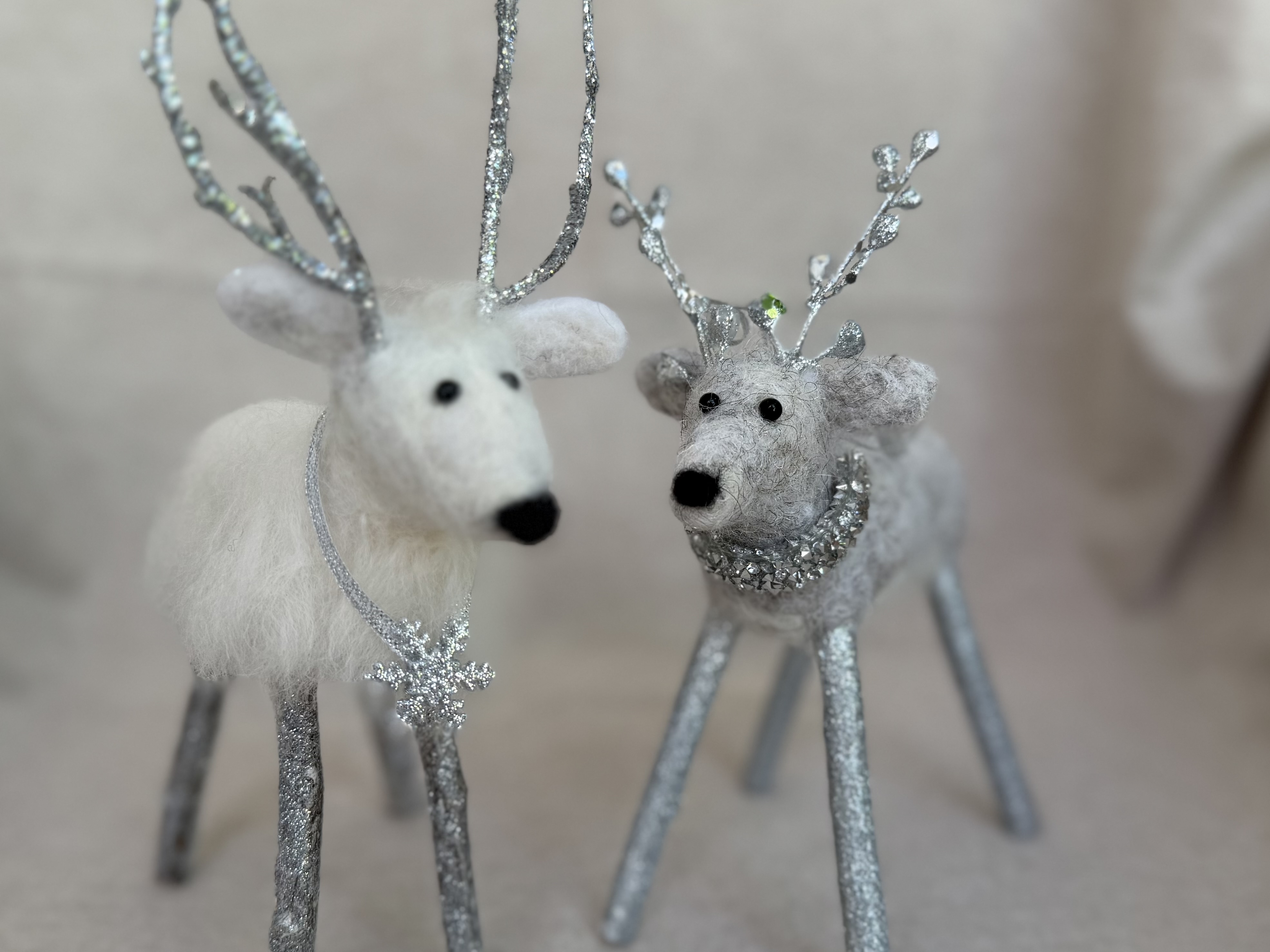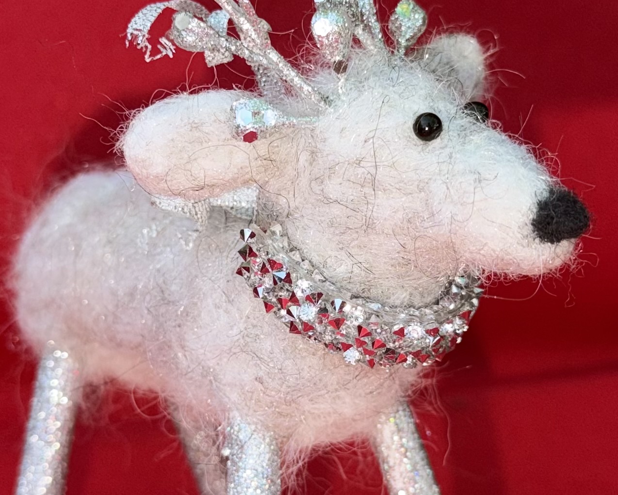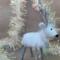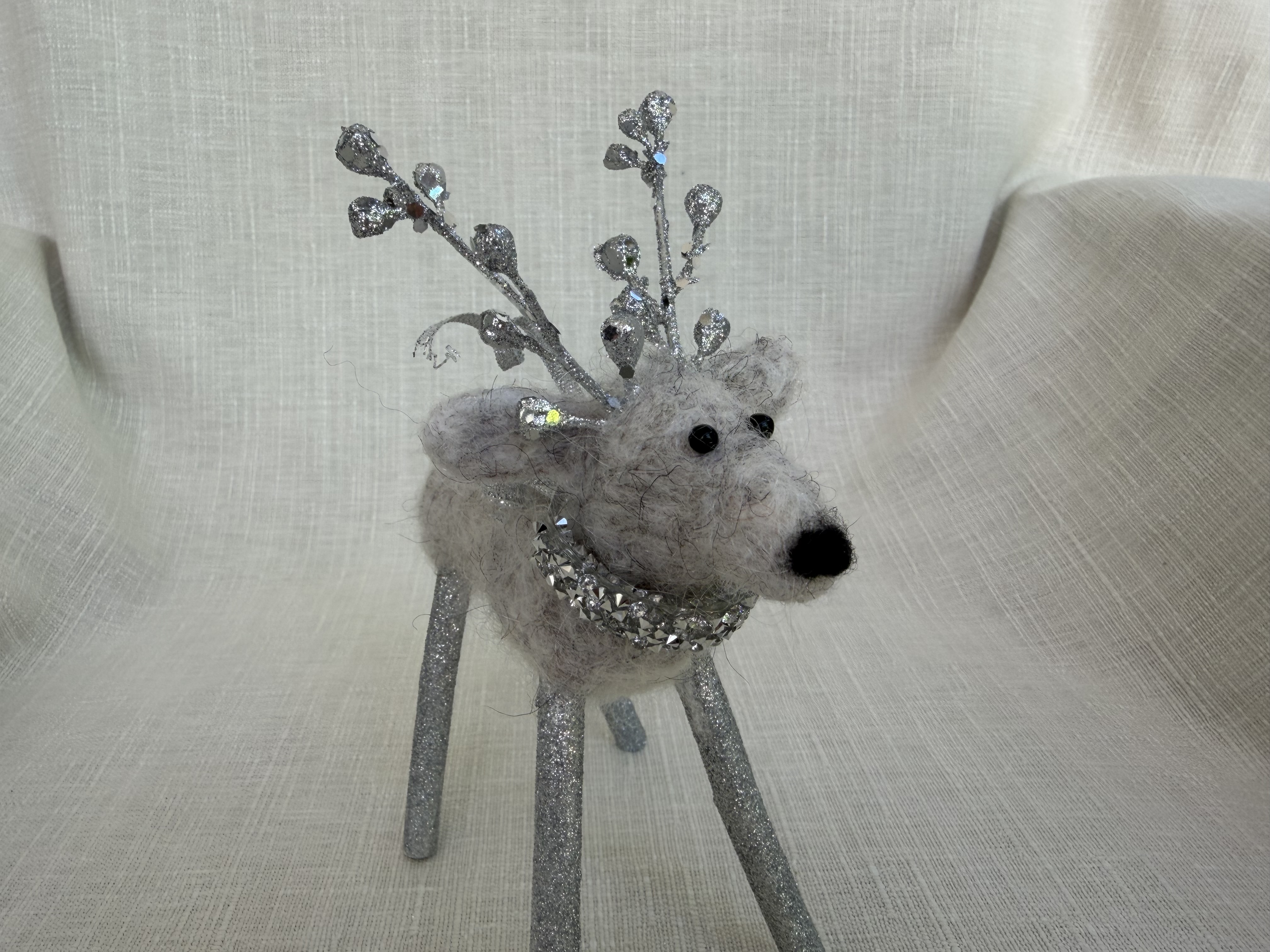 Meet Crystal, a delightful petite needle felted white reindeer brimming with winter wonder. Lovingly handcrafted from soft alpaca wool, Crystal features delicate frosted antlers and a stunning glittery snowflake draped elegantly around her neck like a shimmering collar. Her compact size makes her perfect for smaller spaces, bookshelves, or nestled into holiday vignettes as a younger reindeer. Each detail is carefully sculpted by hand, creating a sweet expression and graceful stance. Crystal's enchanting charm and sparkling accessories make her an ideal gift for reindeer collectors or anyone who treasures handmade holiday magic.