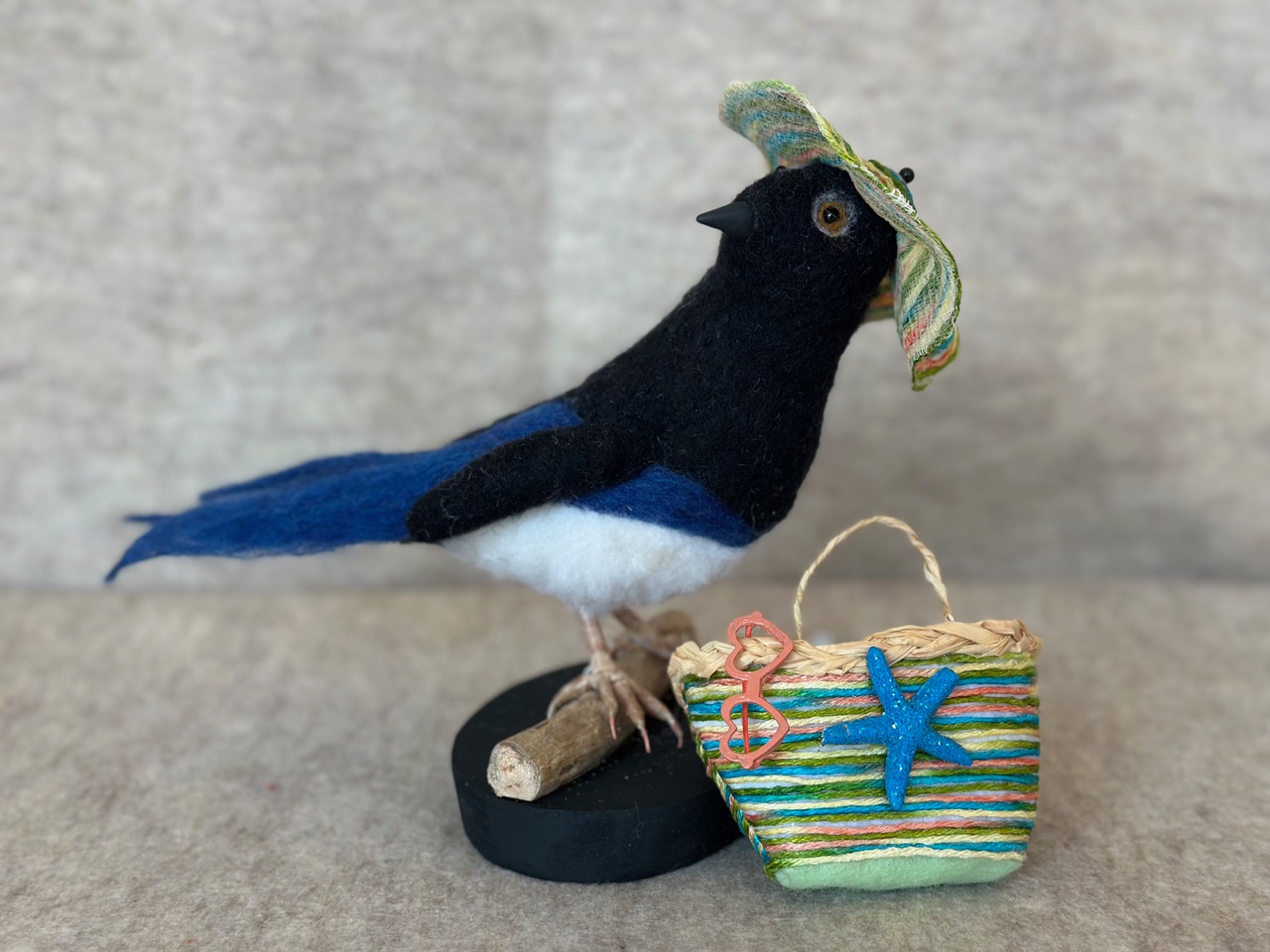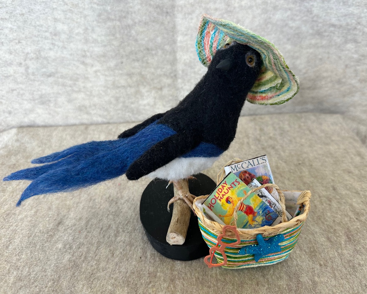 Standing independently, she measures 10” from beak to tail and 7.5” from feet to crown top. She was made completely by hand and is one of a kind creation. Her beach bag is also hand made, a perfect match with her fashionable beach hat, and carries three beach reads. She's attached to a solid wooden pedestal on a branch.