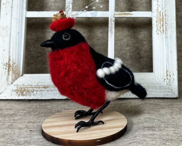 Dressed to impress, this lovely red and black miss is ready to attend your neighborhood backyard celebration. Made with 100% wool and adorned with clay, pearls, and pine cones, Lady Liza is sure to be admired wherever she perches in your home.