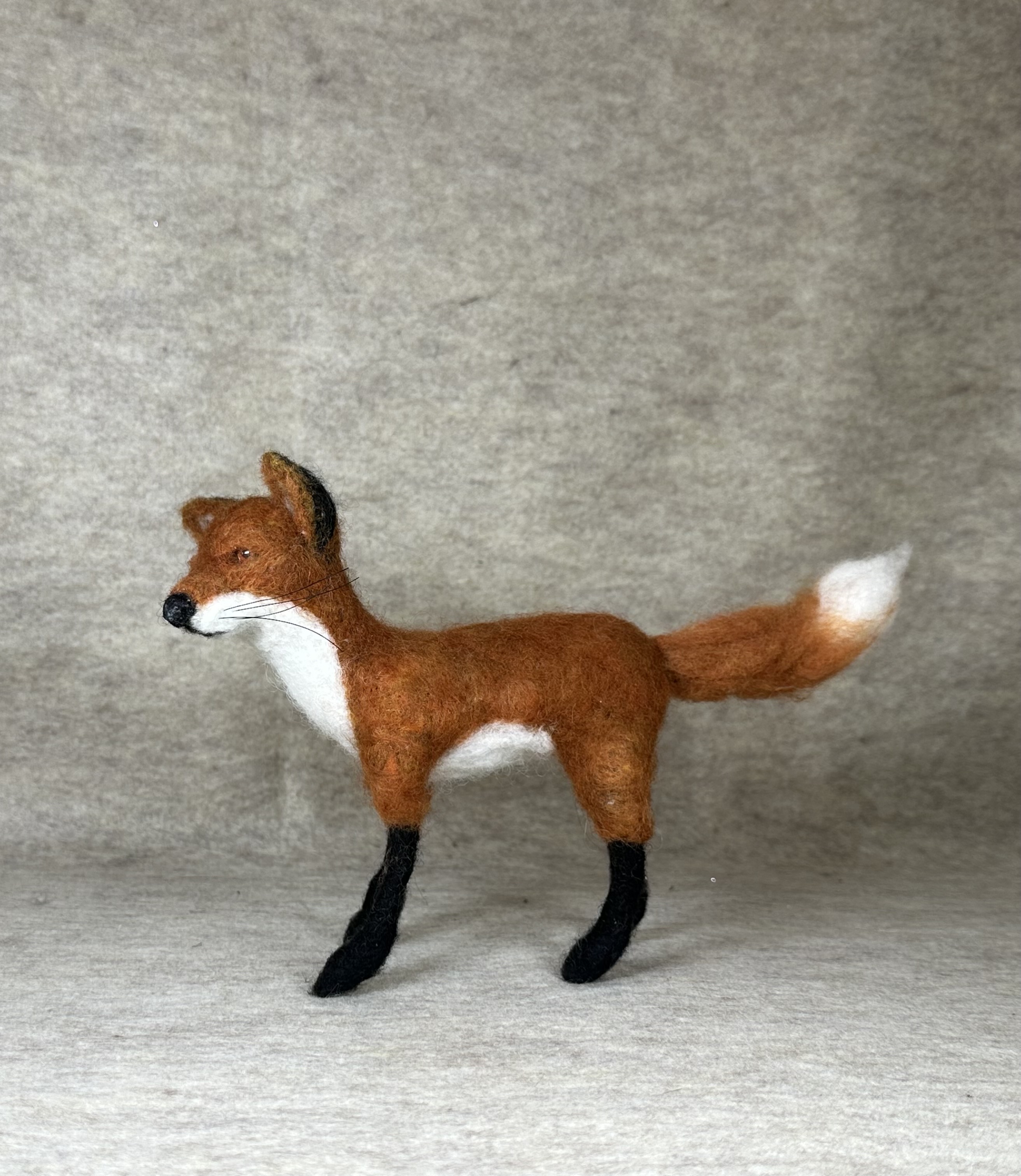Felicia is designed for those who love woodsy animals. With her beautiful red coloring and fluffy, bushy tail, she adds charm to any desk, mantle, or bookshelf. Measuring 10” from nose to tail and 6” from the tip of her ears to her paws, she is the perfect handmade companion. Felicia is truly one of a kind, made with love by me.