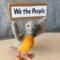 Bird Two - The Herald opens his beak wide. Grey body, gold breast, wings lifted to hold his declaration overhead: "We the Peeple." A reminder, a reclamation, a refusal to be silent.
