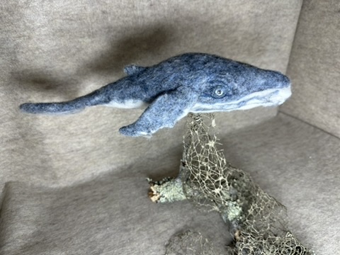 Whale is made of pure 100% wool using needle felting techniques. Needle felting is the art of taking unspun wool roving and poking it with a special barbed needle. The long process of poking tangles the woolen fibers together firming them into sculpted shapes and amazing creations. This whale sculpture took about 50 hours or more to felt. The included clear rod and log are included and are for your display purposes. Once you have decided how you want to place your whale I suggest you glue in place with E6000 glue. This whale is intended to be placed on a shelf or desk and is not a toy.