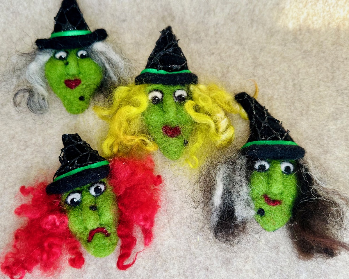 These Enchanted felted witches carry whispers of mischief wherever they pin themselves. Whether perched on your lapel, shawl, or hat brim, they are equal parts charm and cackle and playful power. Each witchy face is unique — a little crooked, a little mysterious, and a whole lot of fun. Clip her on, and you’ve got instant Halloween spirit!