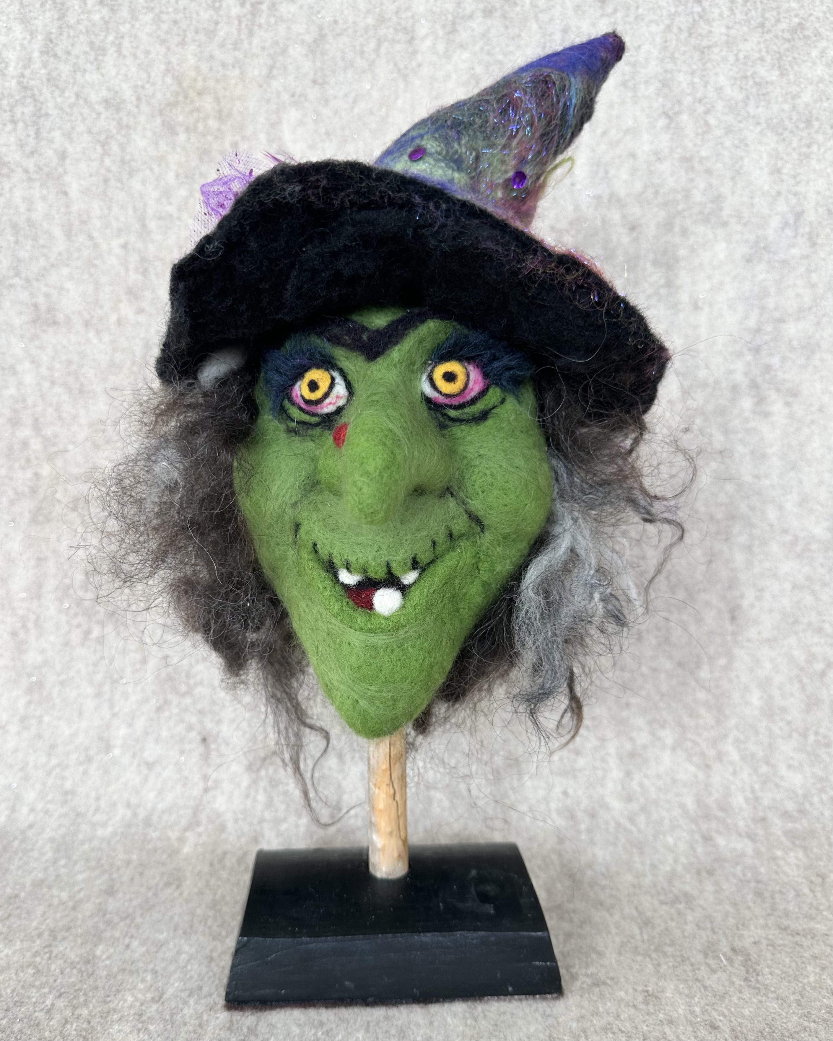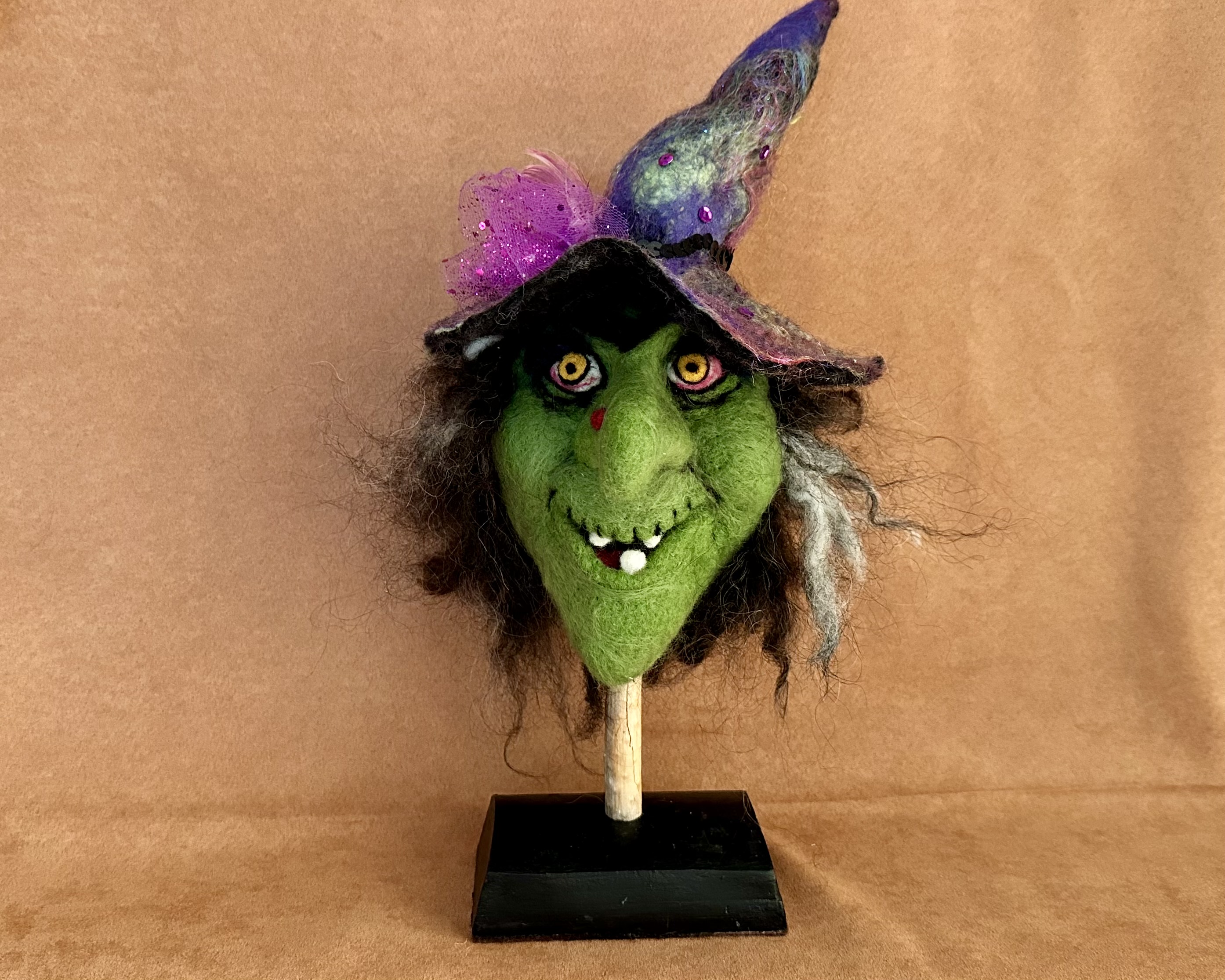 A little bit of horror in small dosages is never a bad thing and add a bowl of candy and let the festivities begin! Her head is held high on a unique stick and attached to a wooden platform. She is created with 100% wool completely hand made and totally unique. She's one in a million and not ONE of a million.